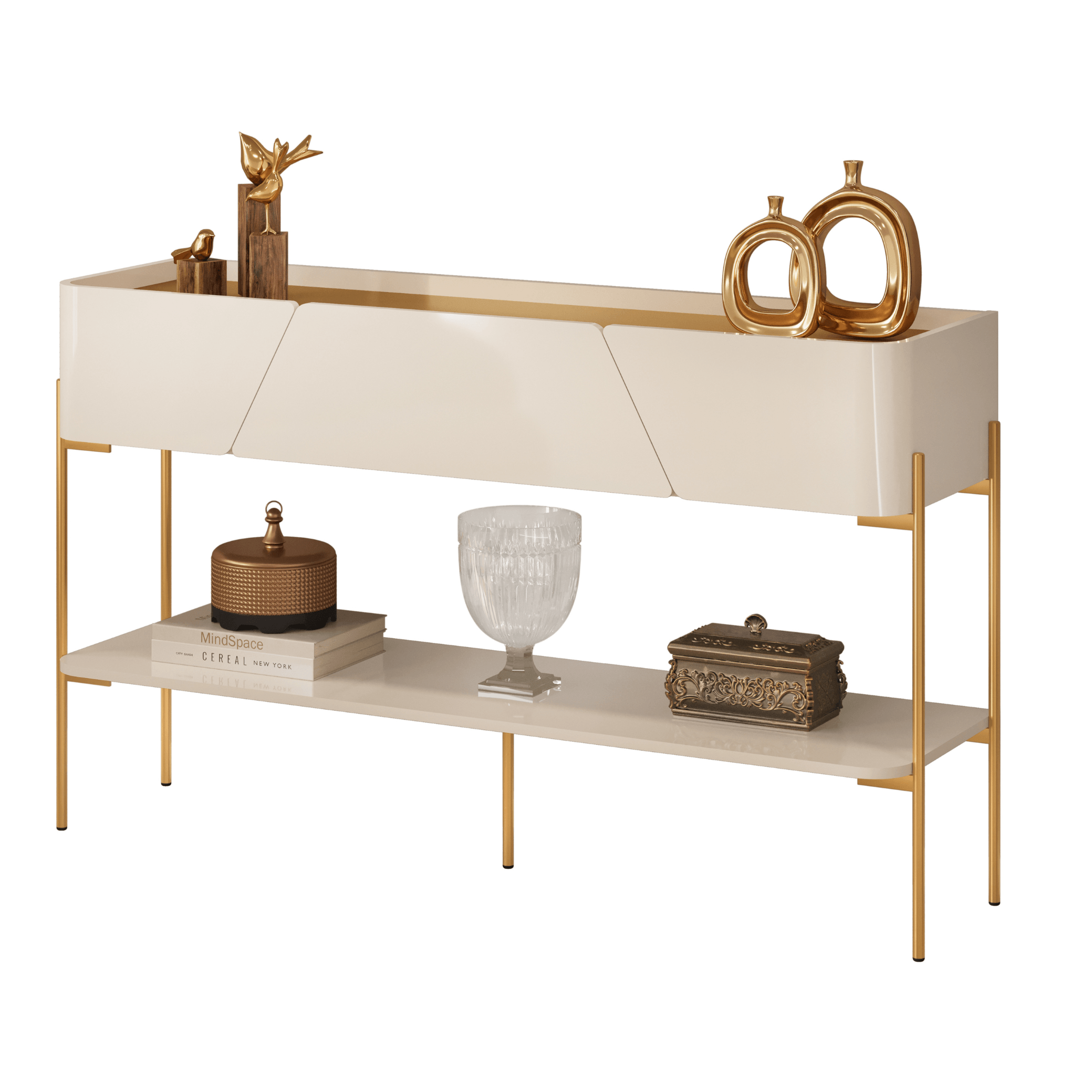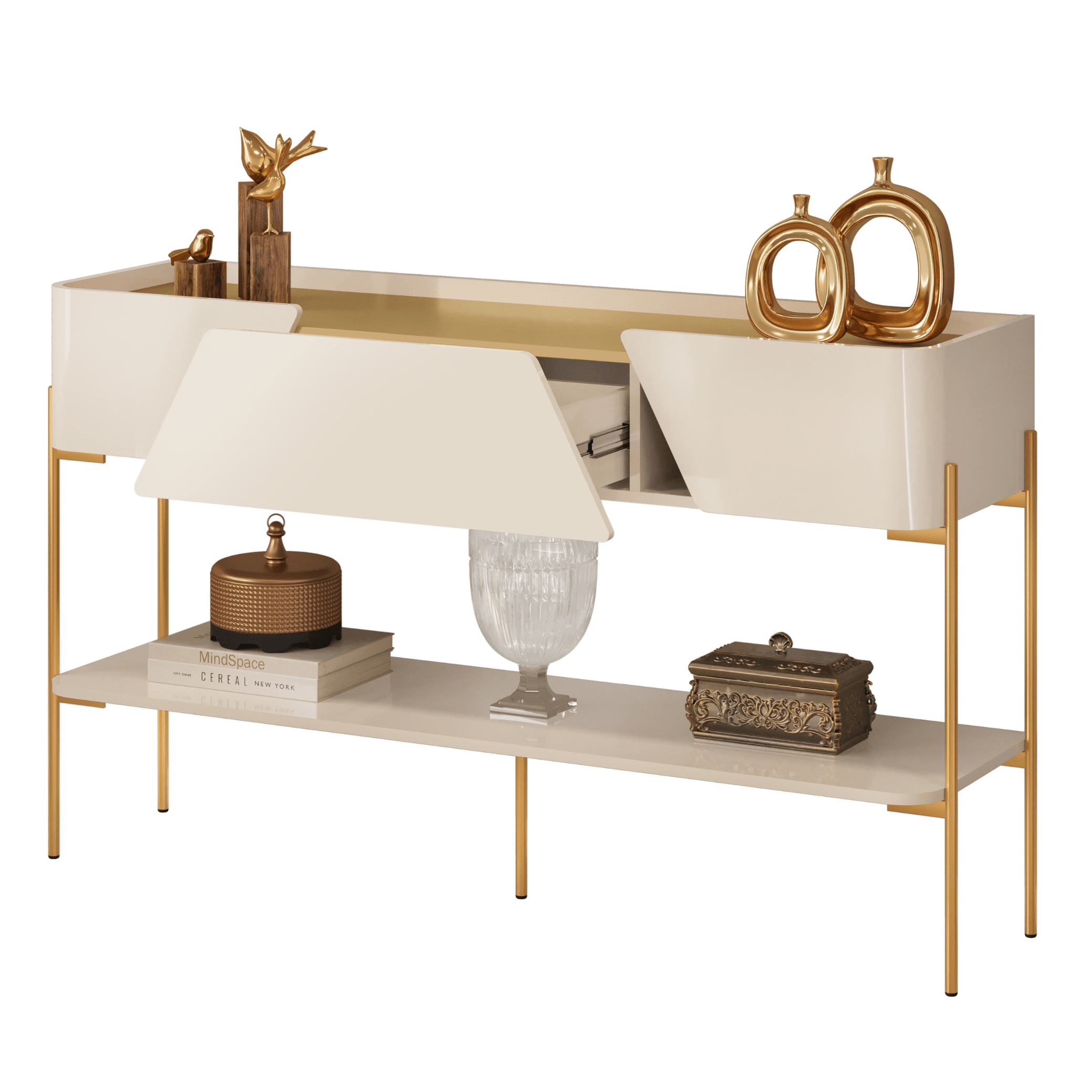 O grande diferencial deste aparador está nos detalhes exclusivos. As portas laterais possuem um recorte diagonal com cantos curvos, fugindo do convencional e trazendo um ar moderno e refinado ao móvel. Sua estrutura é robusta, composta por pés metálicos curvos em aço carbono com acabamento dourado, que garante durabilidade e um toque de requinte.