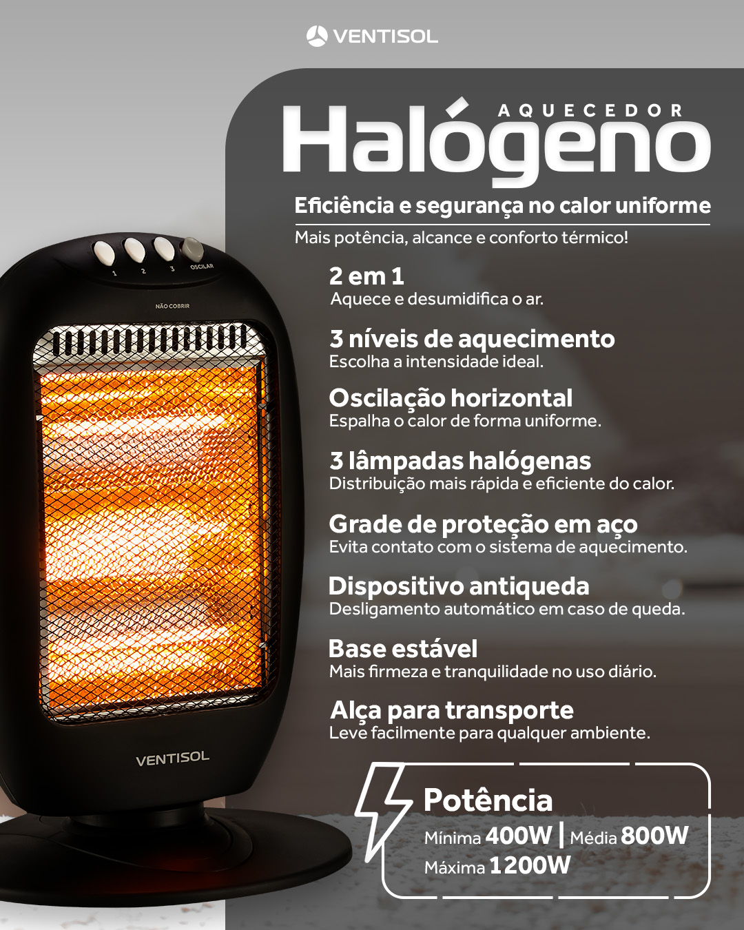 Prepare-se para enfrentar os dias frios com muito mais conforto e segurança! O Aquecedor Halógeno Ventisol AH-02 é a solução ideal para quem busca aquecimento rápido e uniforme para ambientes residenciais. Com um design moderno na cor preta, ele não apenas cumpre sua função, mas também se adapta com elegância a qualquer cômodo da sua casa.