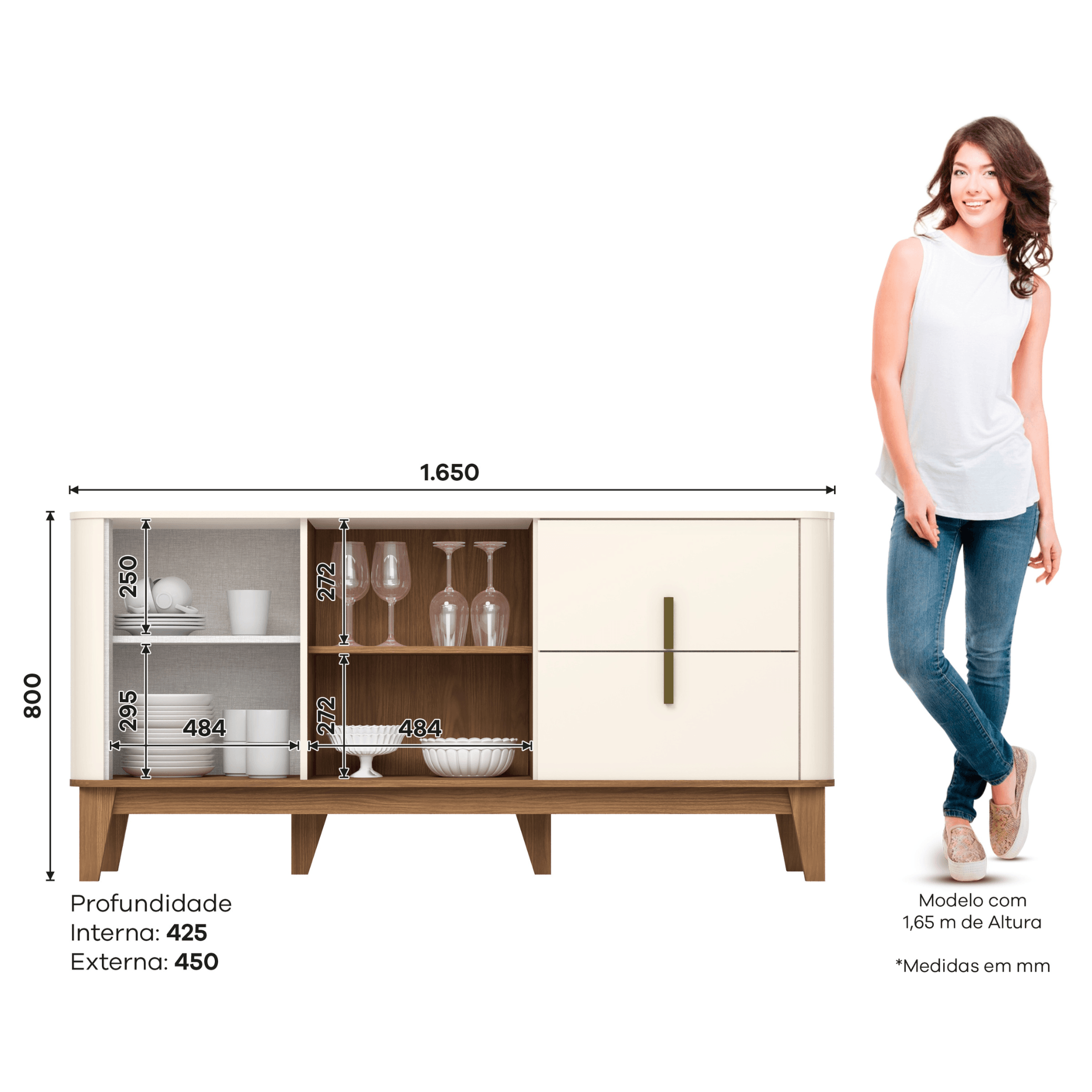 Com 165 cm de largura , este buffet oferece um excelente espaço de superfície para acomodar decorações, bandejas ou servir de apoio durante as refeições, além de possuir um armazenamento interno inteligente.
