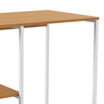 - Tampo e prateleiras com acabamento amadeirado, estilo industrial;