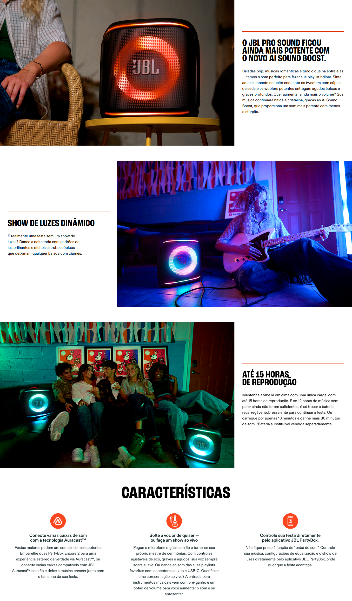 - Som potente e envolvente: grave forte, médios e agudos claros, ótimo para música, shows e festas.