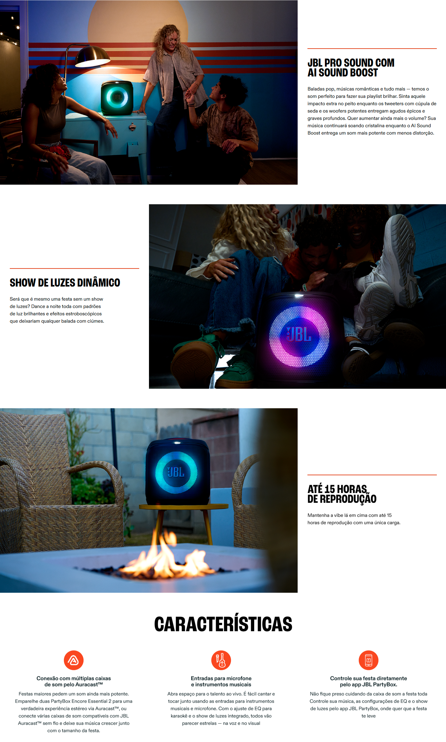 - Multi-caixas com JBL Auracast™ — conecte duas ou mais caixas compatíveis para expandir o som e deixar a festa ainda mais potente.