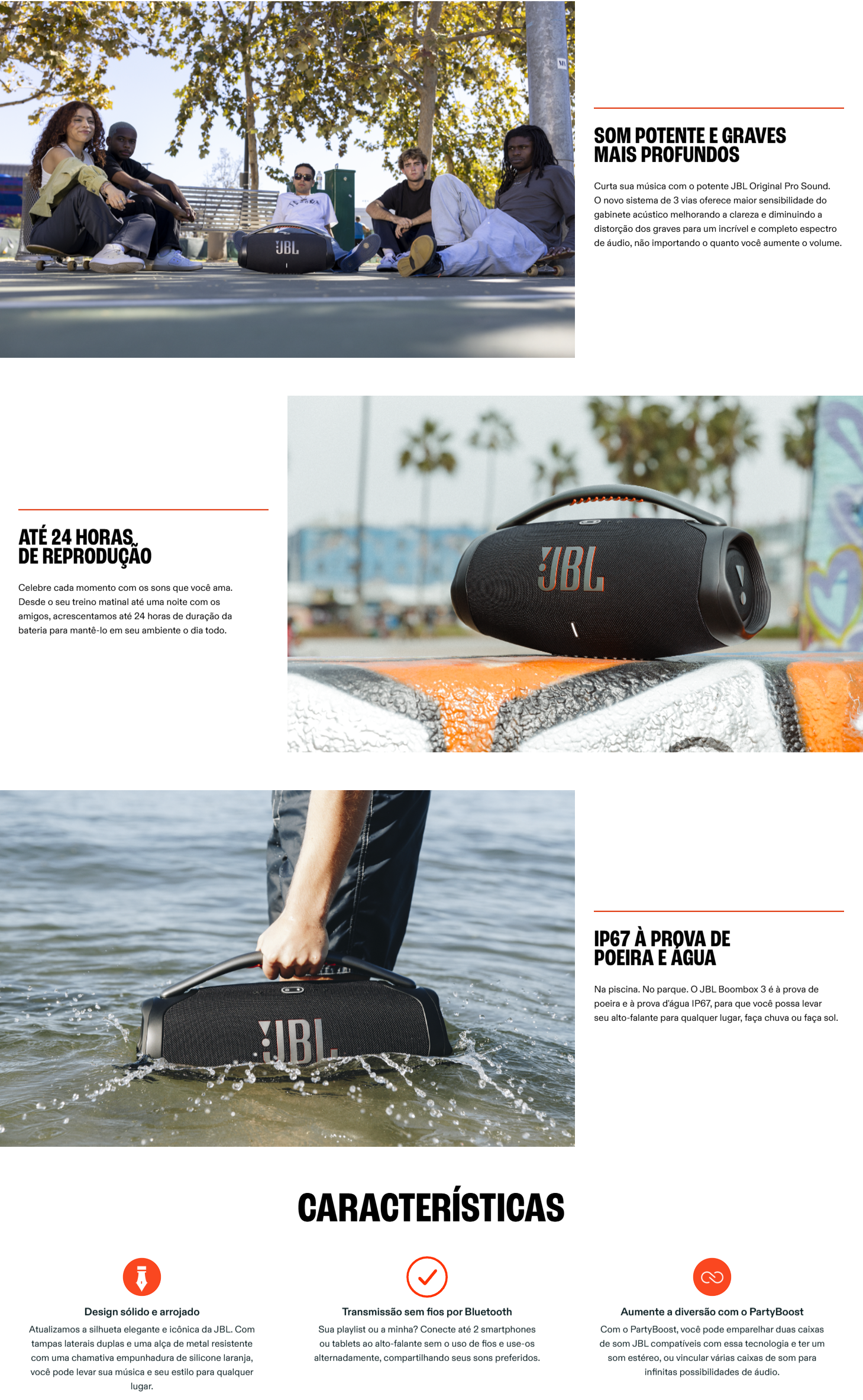 A JBL Boombox 3 entrega JBL Original Pro Sound com um sistema de três vias: subwoofer + médios + agudos, garantindo clareza mesmo em volumes altos, sem distorção.
