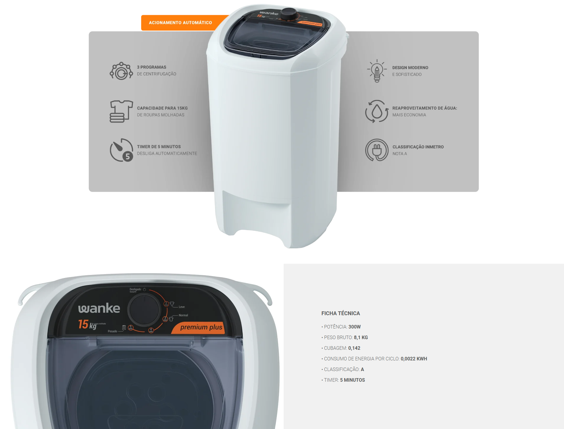 Centrifuga de Roupas Wanke Premium Plus 15Kg com Timer