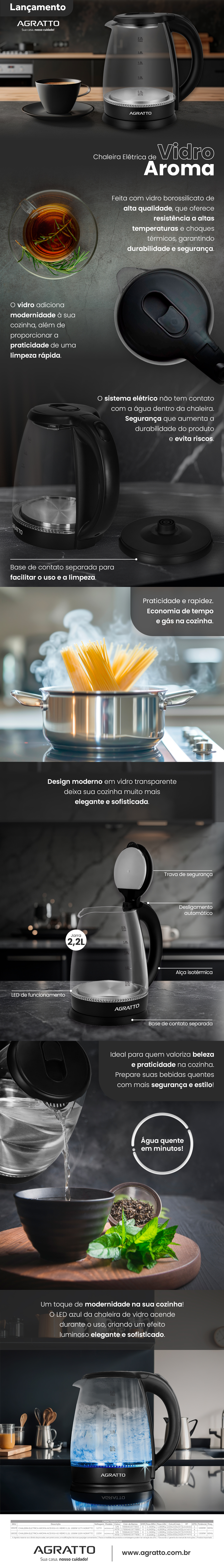 A Chaleira Elétrica Agratto Aroma ACEV01L02 une praticidade e beleza em um só produto. Seu corpo em vidro resistente com acabamento em aço inox garante um visual elegante e moderno para qualquer cozinha. Com 2,2 litros de capacidade, é perfeita para preparar água quente em grandes quantidades de uma só vez. Ideal para chás, cafés, chimarrão, sopas instantâneas e diversas receitas do dia a dia. Equipada com 1500W de potência, aquece a água de forma rápida e eficiente, economizando tempo e oferecendo mais comodidade na rotina.