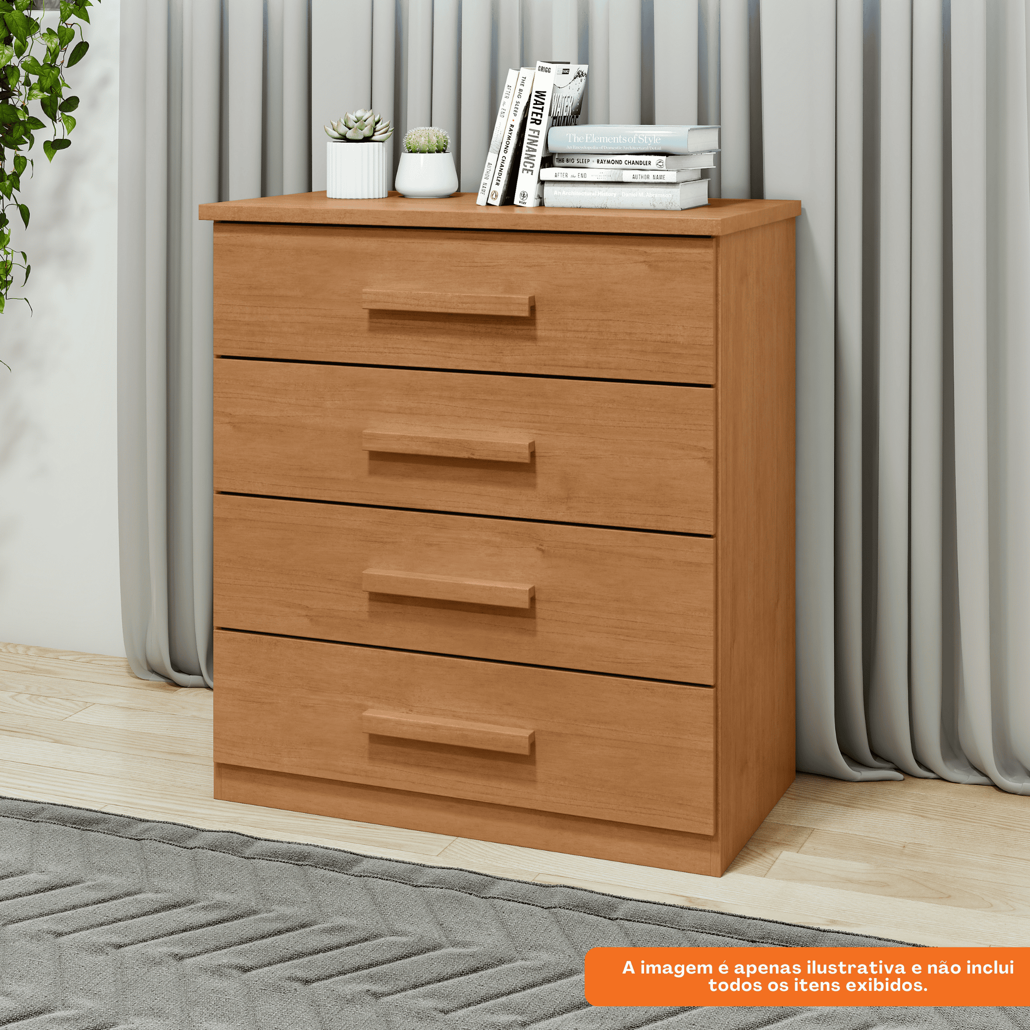 O móvel conta com 4 gavetas espaçosas, equipadas com corrediças telescópicas, que proporcionam abertura total e suave, evitando empenos e garantindo praticidade no uso. Seu tampo de 25mm confere mais resistência e robustez, tornando-a perfeita tanto para organizar roupas e pertences pessoais quanto para apoiar objetos decorativos.