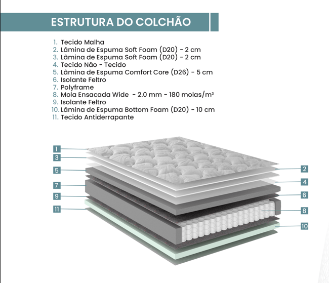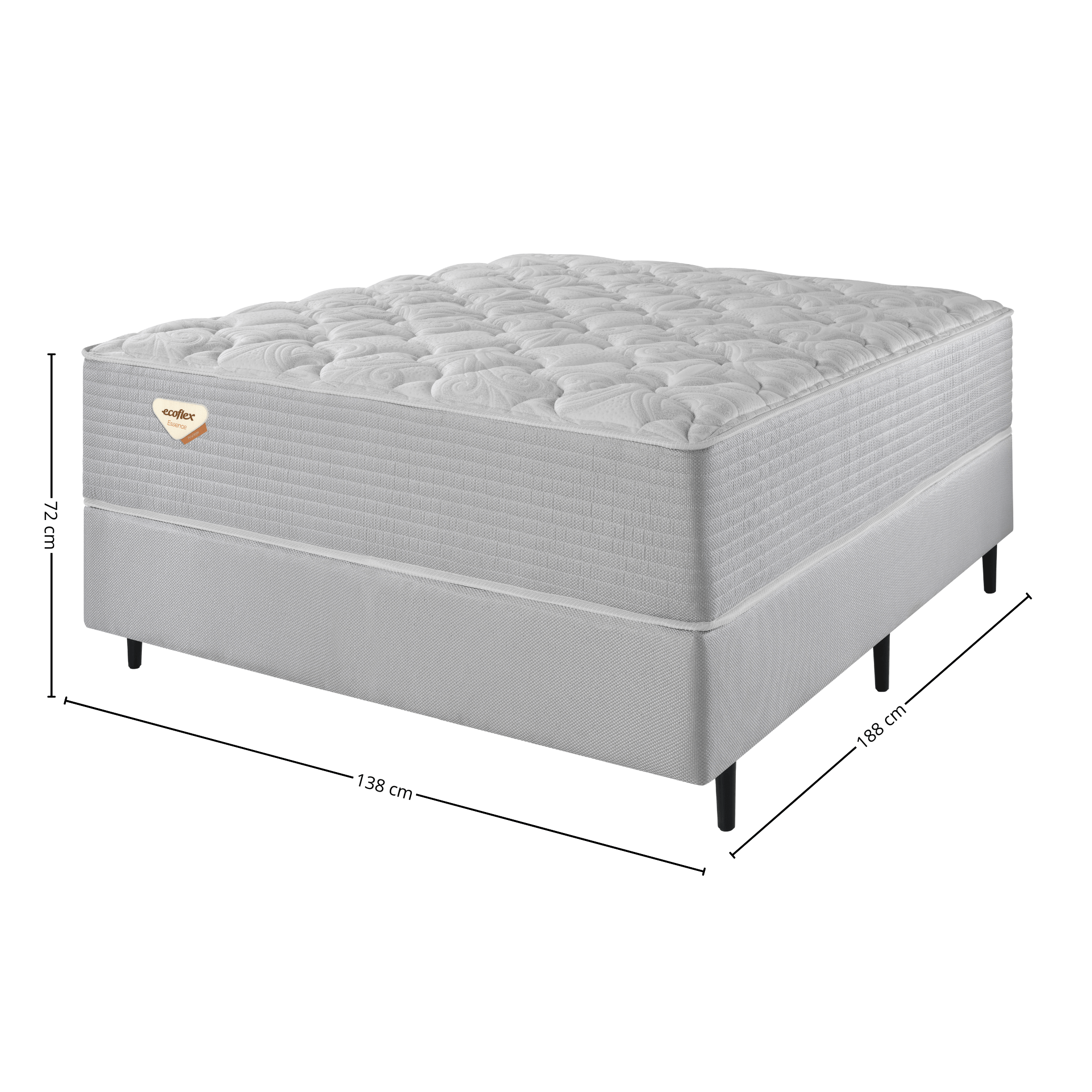 A cama tem dimensões de 138x188x72cm, sendo composta por uma base robusta e um colchão com 35 cm de altura, ambos projetados para otimizar a durabilidade e o suporte. A estrutura do colchão conta com a tecnologia Wide, que oferece molas com diâmetro ampliado para garantir um equilíbrio perfeito entre firmeza e conforto. O revestimento de alta qualidade e toque macio proporciona um visual elegante, além de auxiliar na ventilação do colchão, garantindo noites mais frescas.