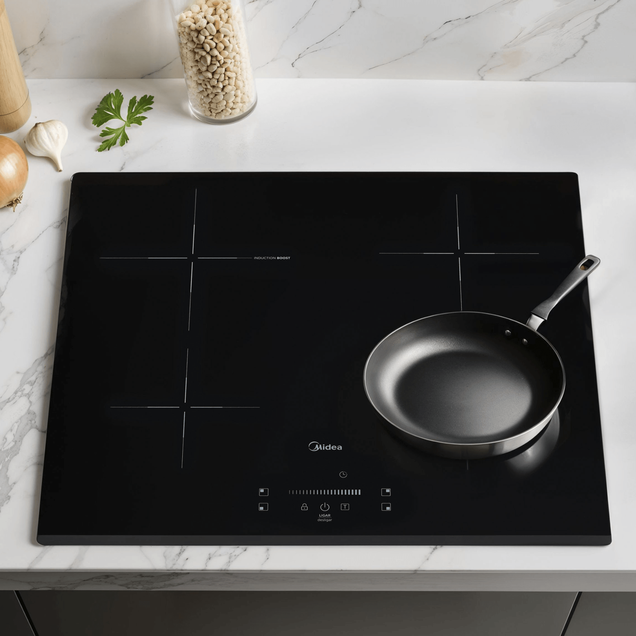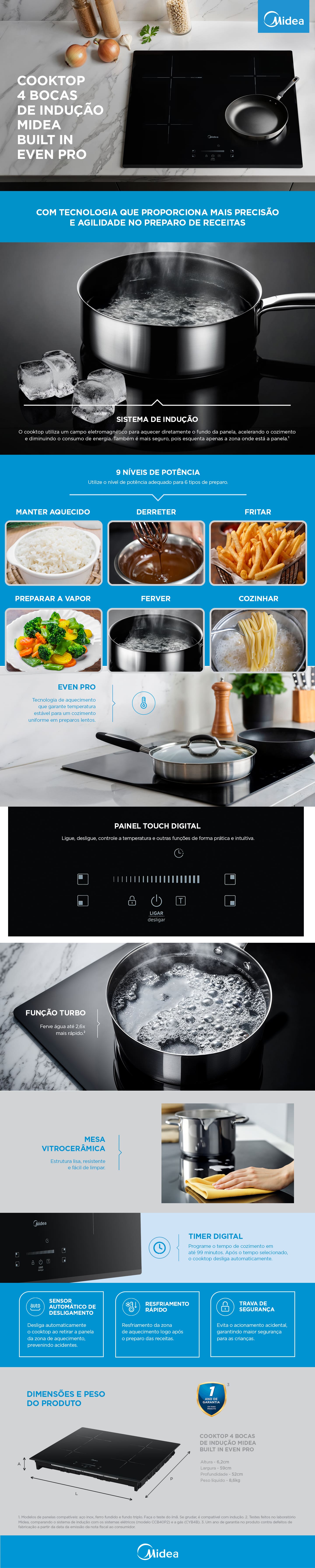 Transforme sua cozinha com elegância e alta performance usando o Cooktop de Indução Midea de 4 bocas. Com mesa vitrocerâmica preta, design moderno e tecnologia avançada, este modelo proporciona rapidez, segurança e praticidade para o seu dia a dia.