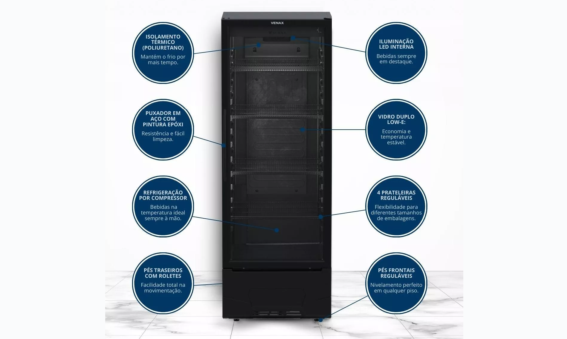 - Iluminação Interna: LED branco que destaca os produtos e atrai a atenção dos clientes.