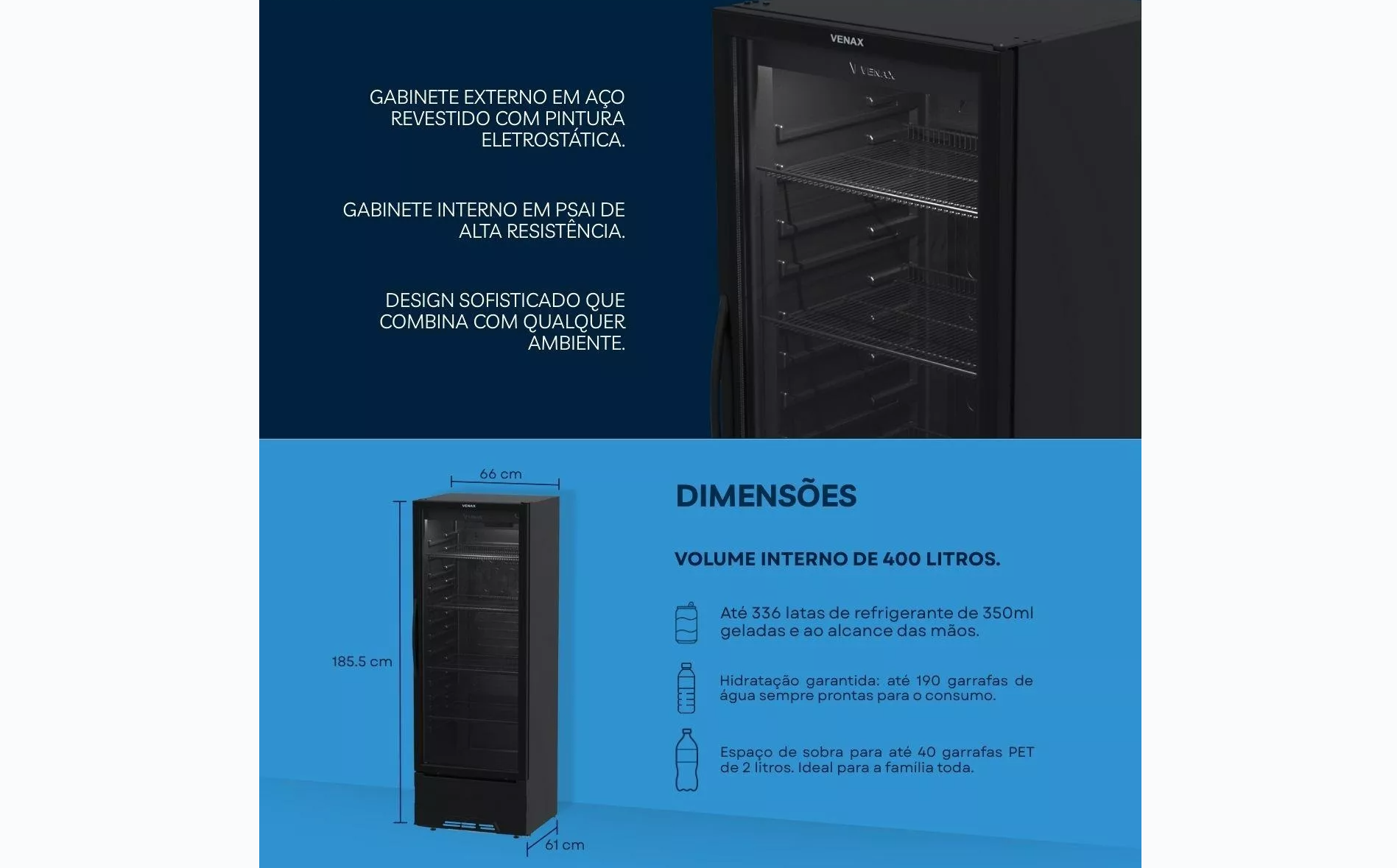 - Capacidade de Armazenamento: Acomoda até 336 latas de 350 ml, 257 latas de 473ml, 330 longnecks de 355ml, 175 garrafas de 600ml, 92 garrafas de 1L ou 40 garrafas de 2L.
