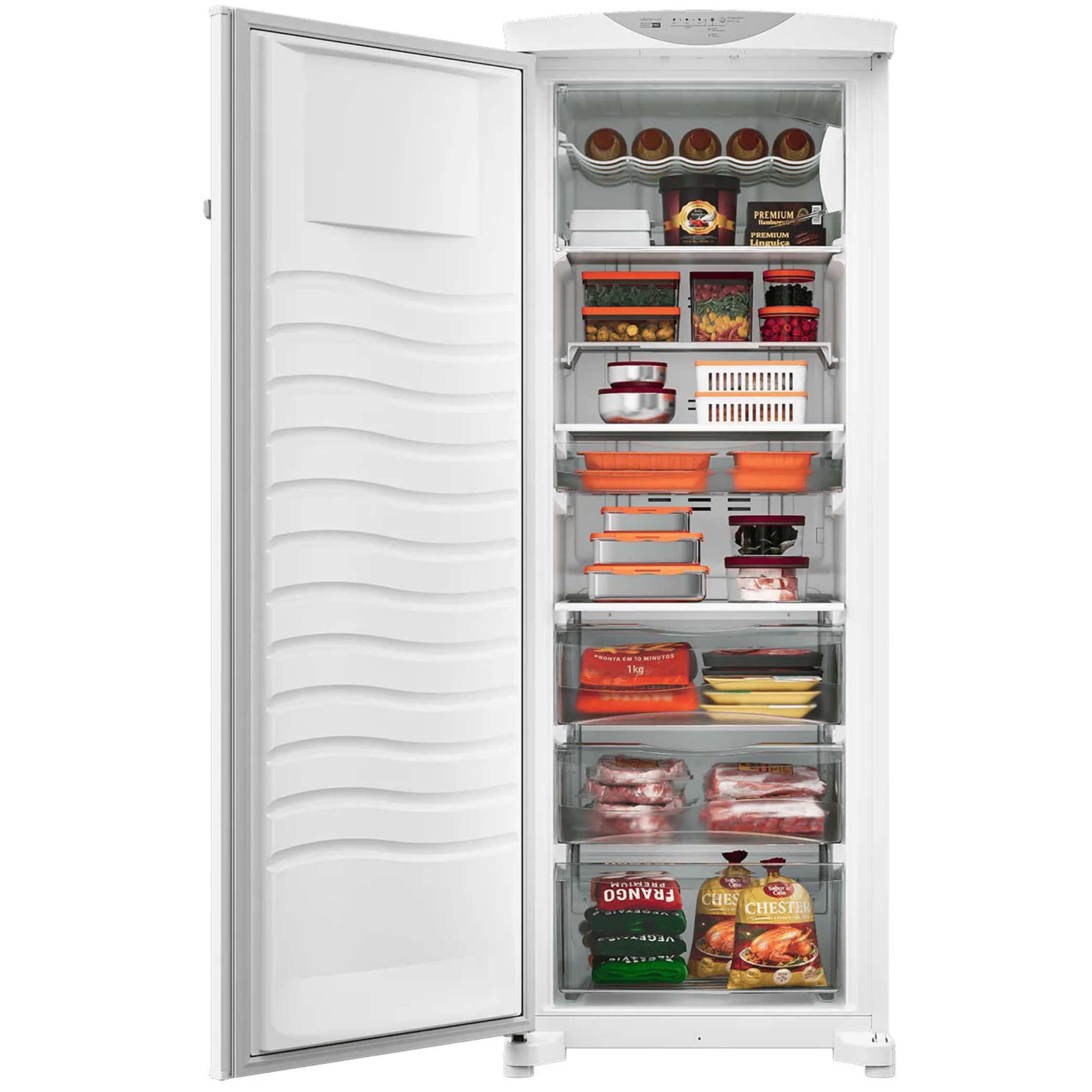 Seu design vertical facilita o acesso aos alimentos e produtos, enquanto a capacidade de 276 litros garante amplo espaço para congelar grandes volumes de itens com facilidade.