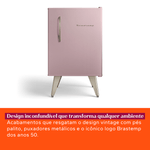 Design inconfundível que transforma qualquer ambiente: Onde chega, o Frigobar Brastemp Retrô se torna o destaque, deixando aquele canto da casa com ainda mais personalidade e transformando o seu mundo. Os acabamentos resgatam o design vintage com pés palito, puxadores metálicos e o icônico logo Brastemp dos anos 50.