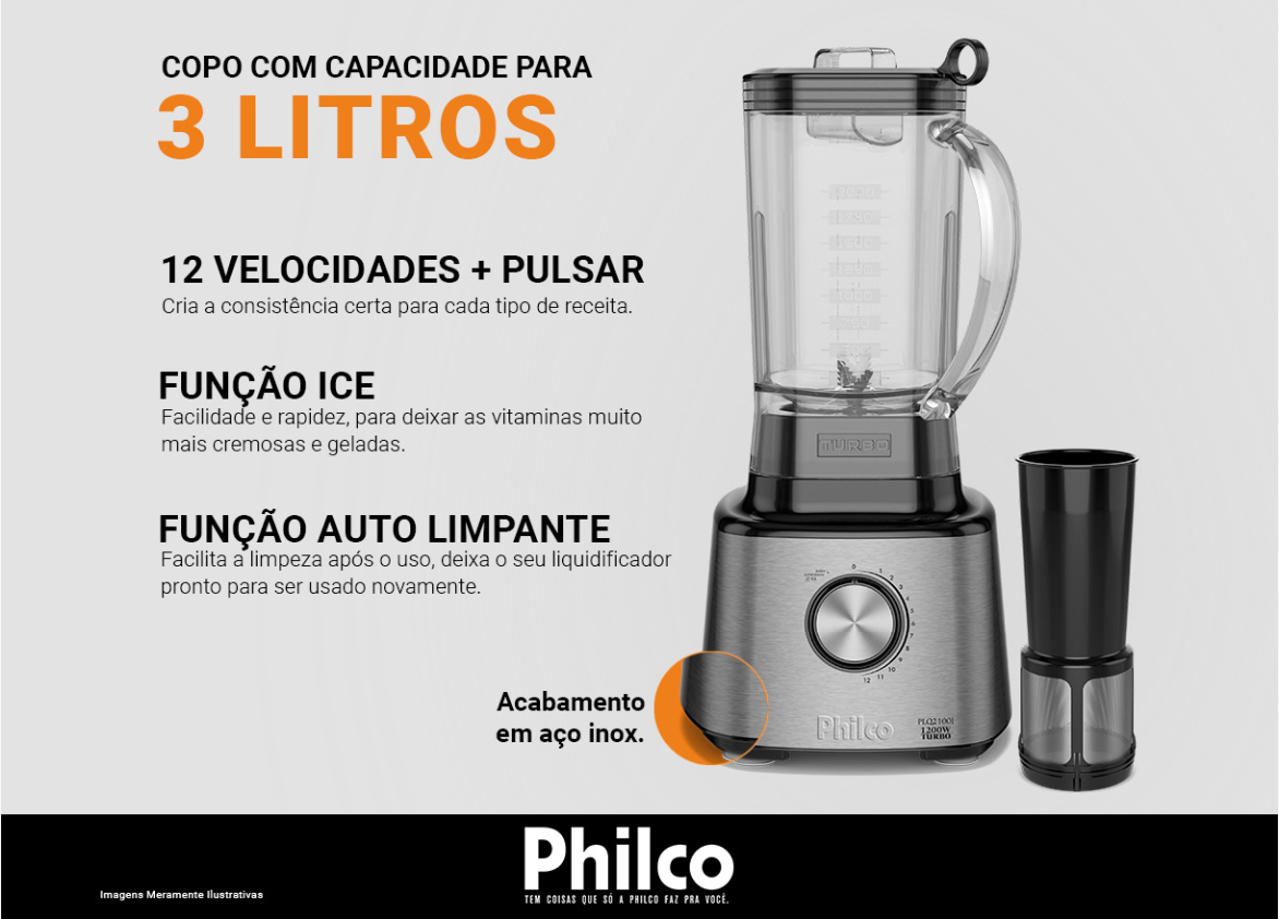 Descubra o Liquidificador Philco PLQ2100PI 12+Turbo 3L 1200W, ideal para quem busca alta performance na cozinha. Com 1200 watts de potência, jarra de 3 litros, 12 velocidades + função turbo, ele tritura gelo, frutas e legumes com agilidade e consistência.