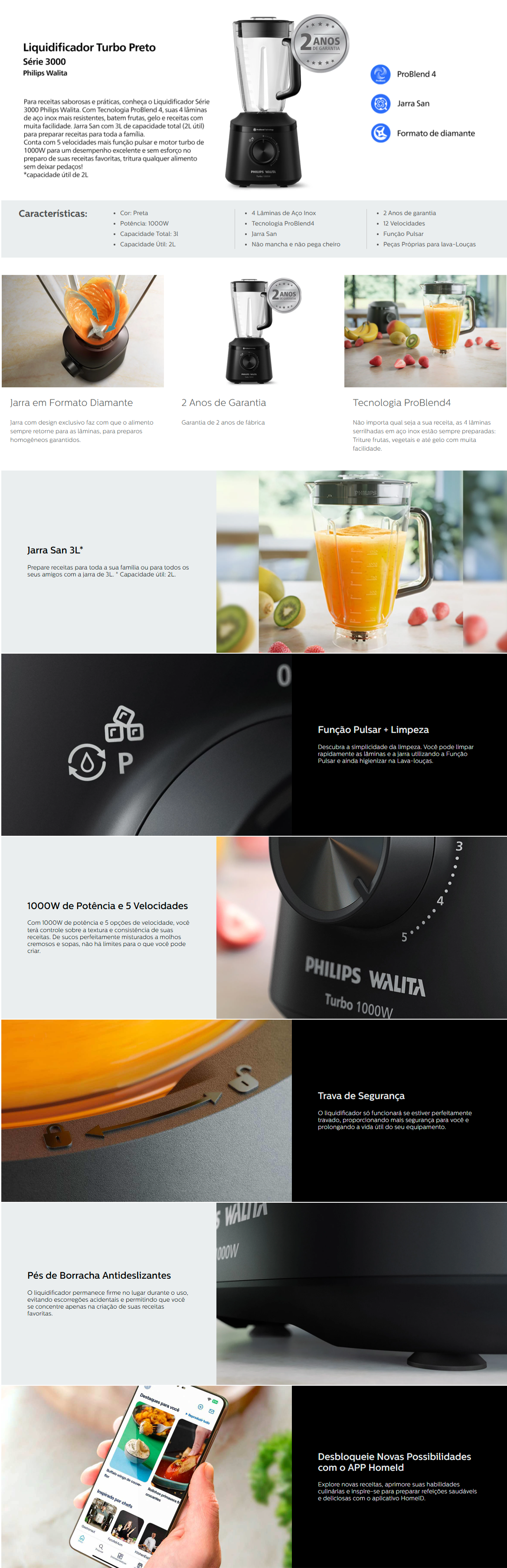 Transforme sua rotina na cozinha com mais praticidade, potência e design inteligente. O Liquidificador Série 3000 Turbo da Philips Walita reúne recursos premium para preparar sucos, vitaminas, sopas, sobremesas e muito mais com agilidade e qualidade.