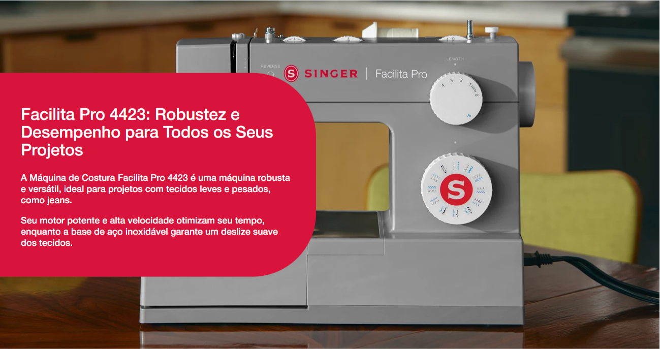 Descubra o poder da Singer Facilita Pro 4423, uma máquina desenvolvida para quem busca alto desempenho no dia a dia. Com 23 pontos ajustáveis, estrutura reforçada em metal e motor potente, ela garante costuras rápidas, firmes e com acabamento profissional em diversos tipos de tecidos, desde os mais leves até os mais grossos, como jeans e sarja.