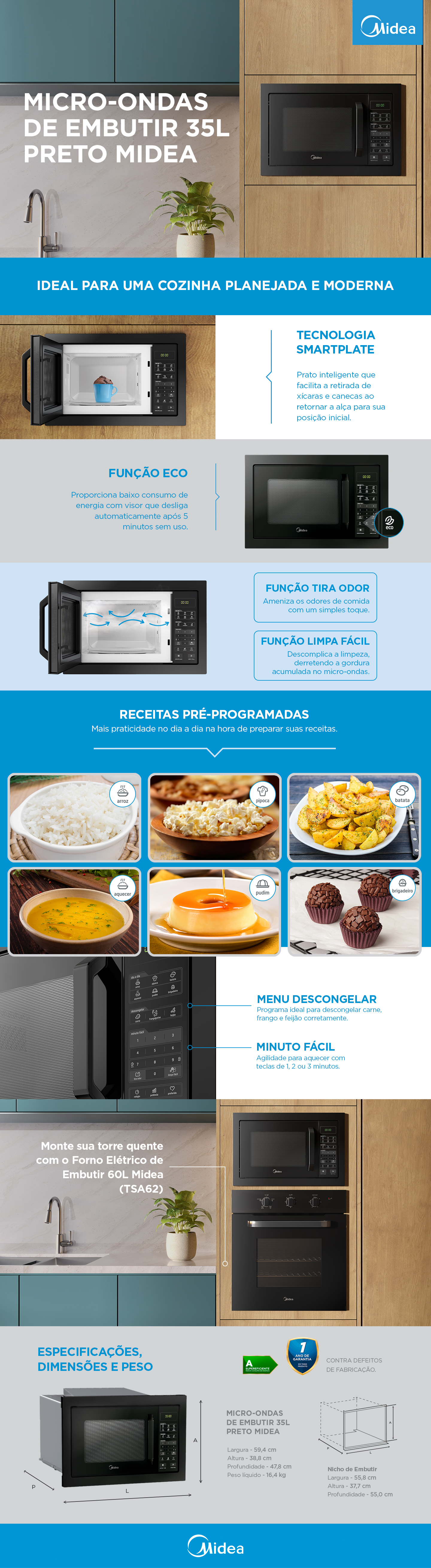 Transforme sua cozinha com o Micro-ondas de Embutir Midea 35 Litros, um modelo completo, elegante e ideal para quem busca design planejado, tecnologia avançada e funções que facilitam o dia a dia.