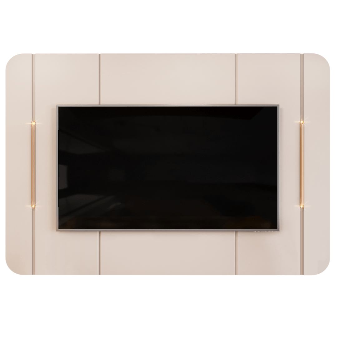 - Painel com frisos chanfrados e luminárias na cor dourada;