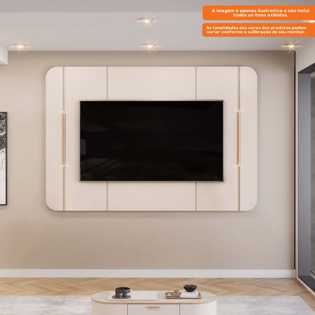 O Painel Adele será o destaque da sua sala de estar, com uma estética contemporânea e encantadoramente elegante. O painel possui duas abas com charmosos cantos arredondados e que são iluminados por dois tubos metálicos dourados com LED, que abrilhantam e emolduram o amplo painel que abriga TV’s de até 65”, garantindo o melhor do entretenimento para sua família. A resistência do Painel é de até 40Kg, permitindo que você escolha a TV ideal para usar com este móvel. Ainda sobre o Painel da TV, ele conta com duas junções chanfradas em borda soft, adicionando um toque extra ao conjunto. O Painel Adele é produzida 100% em MDF, utilizando chapas de madeira reconstituída provenientes de reflorestamento, uma matéria prima que não prejudica o ambiente e garante durabilidade e resistência ao seu produto. O Painel Adele é um produto cheio de benefícios, perfeito para dar aquele toque especial à sua casa. Aproveite e torne seu lar mais acolhedor com este lindo conjunto.
