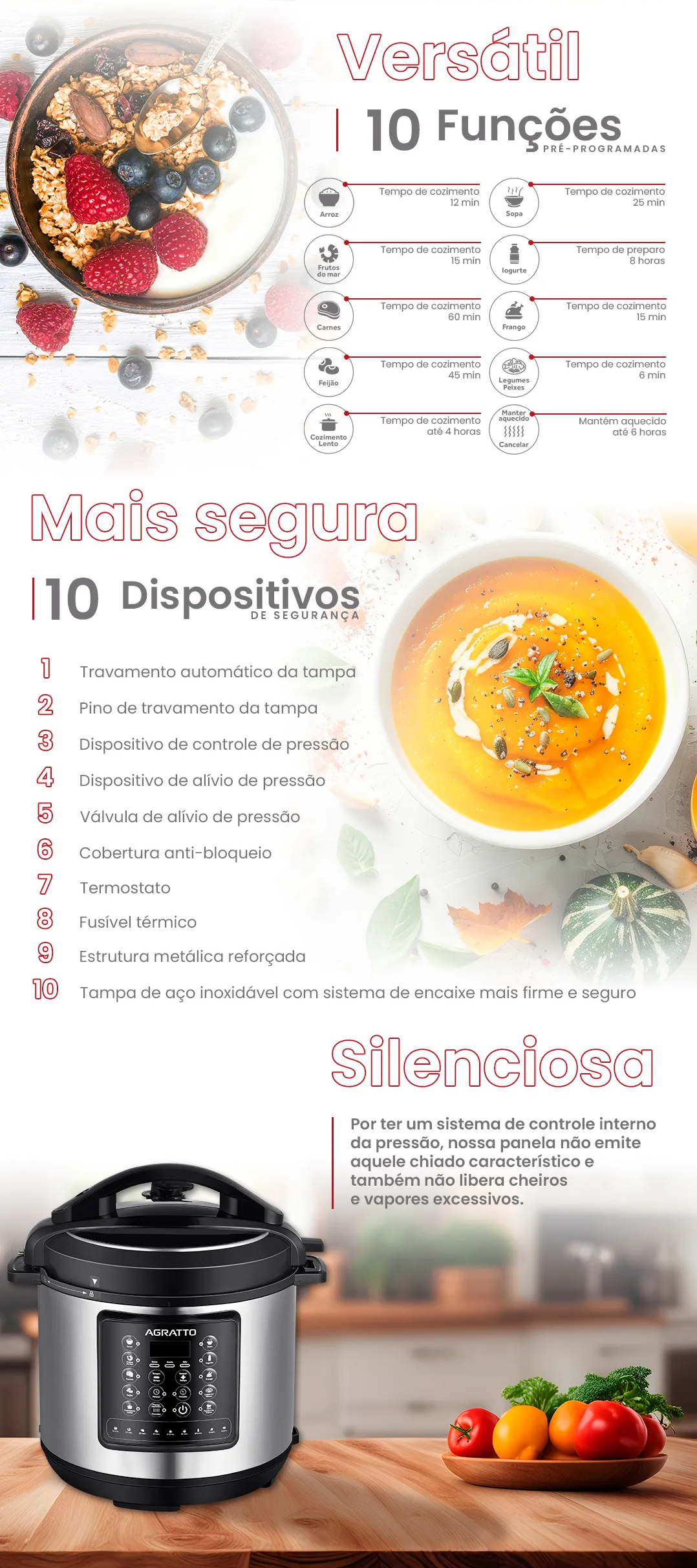 - Segurança Reforçada: Esqueça o medo da pressão! Possui 10 dispositivos de segurança que garantem o travamento da tampa e o controle preciso da pressão interna.