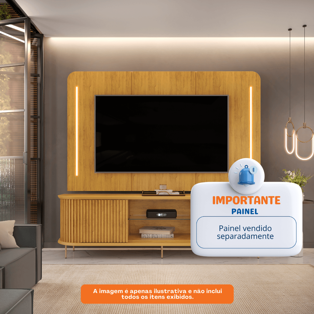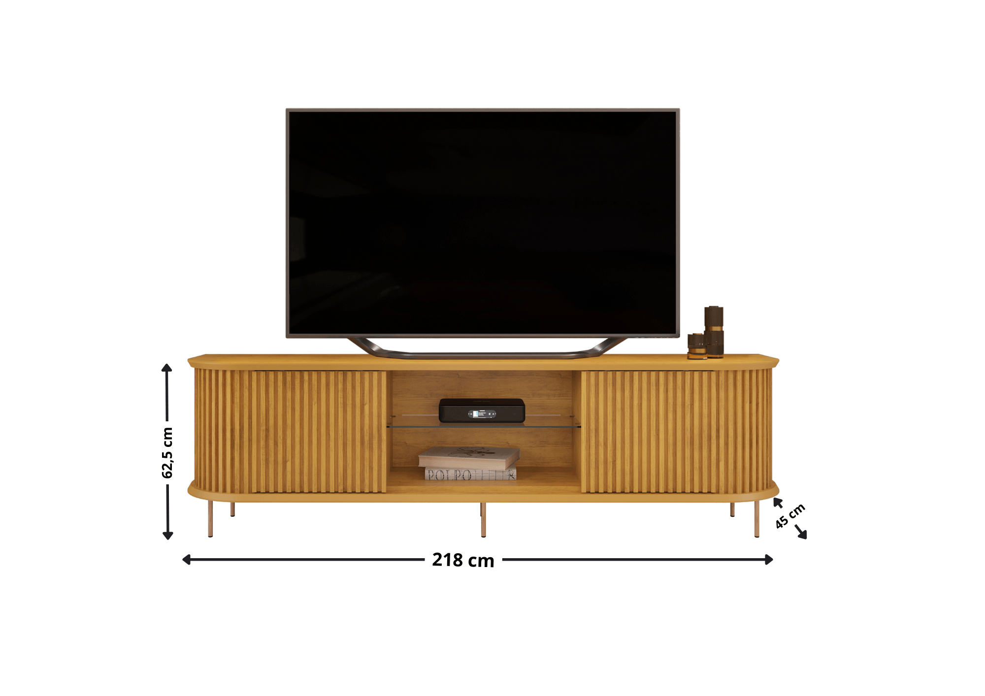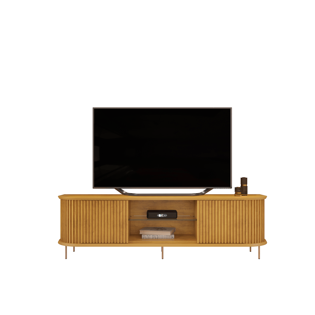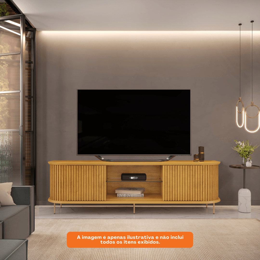 Se você busca sofisticação e muita elegância para sua sala de estar, o Rack Atlas é uma excelente escolha. O Rack conta com laterais curvas ripadas decorativas, tampo e base usinados com cantos curvos acompanhando as laterais e com bordas chanfradas, trazendo as mais atuais tendências de design. Para armazenar seus objetos, conte com duas espaçosas portas deslizantes e ripadas. O Rack ainda conta com dois espaços para aparelhos eletrônicos, uma prateleira de vidro e um espaço abaixo dela, garantindo o melhor do entretenimento. Não se preocupe com os cabos, este produto possui passa-fios para facilitar a organização dos cabos por trás do produto. Para facilitar a limpeza, a bancada é estruturada com pés metálicos cilíndricos na cor dourada, que a afastam do chão, aumentando sua durabilidade.