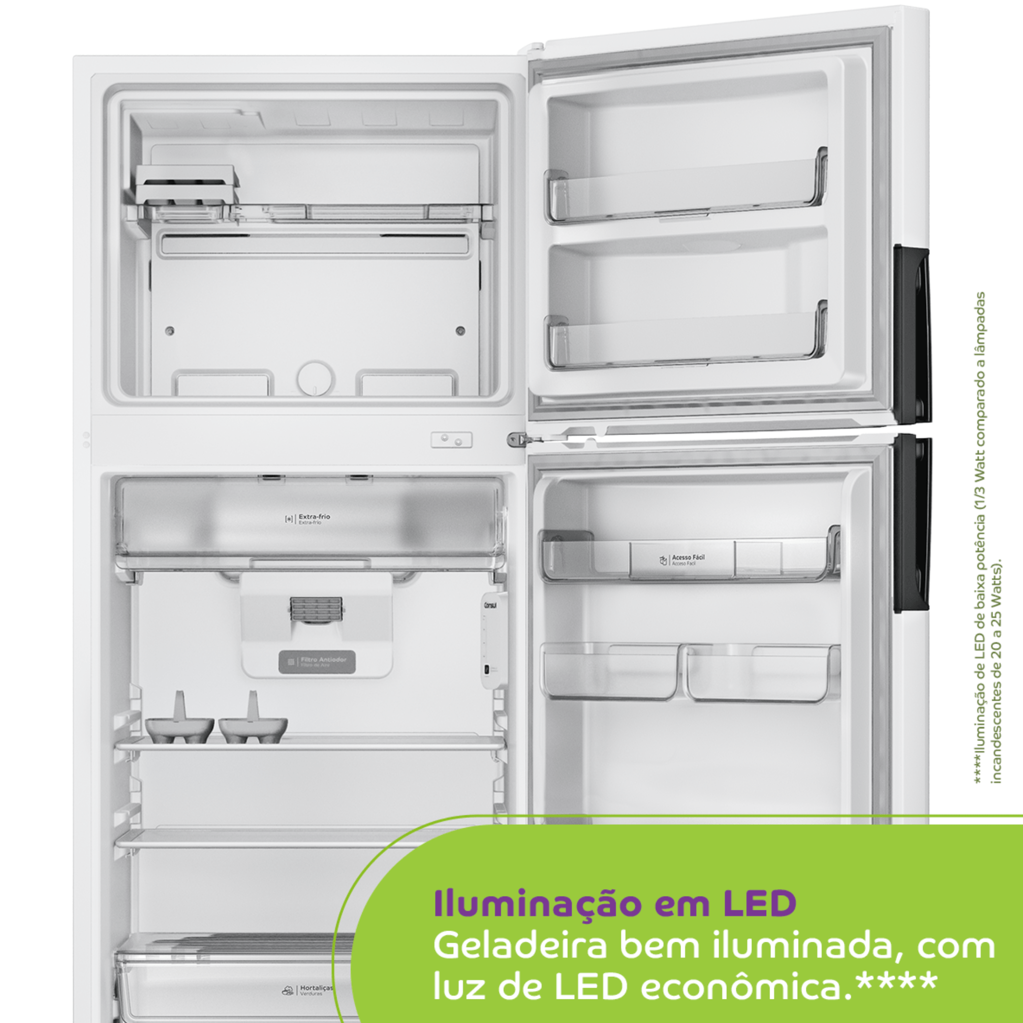 - Iluminação em LED: Geladeira bem pensada e bem iluminada, com luz de LED econômica* que ajuda a visualizar tudo que tem dentro de um jeito fácil e rápido. [4]