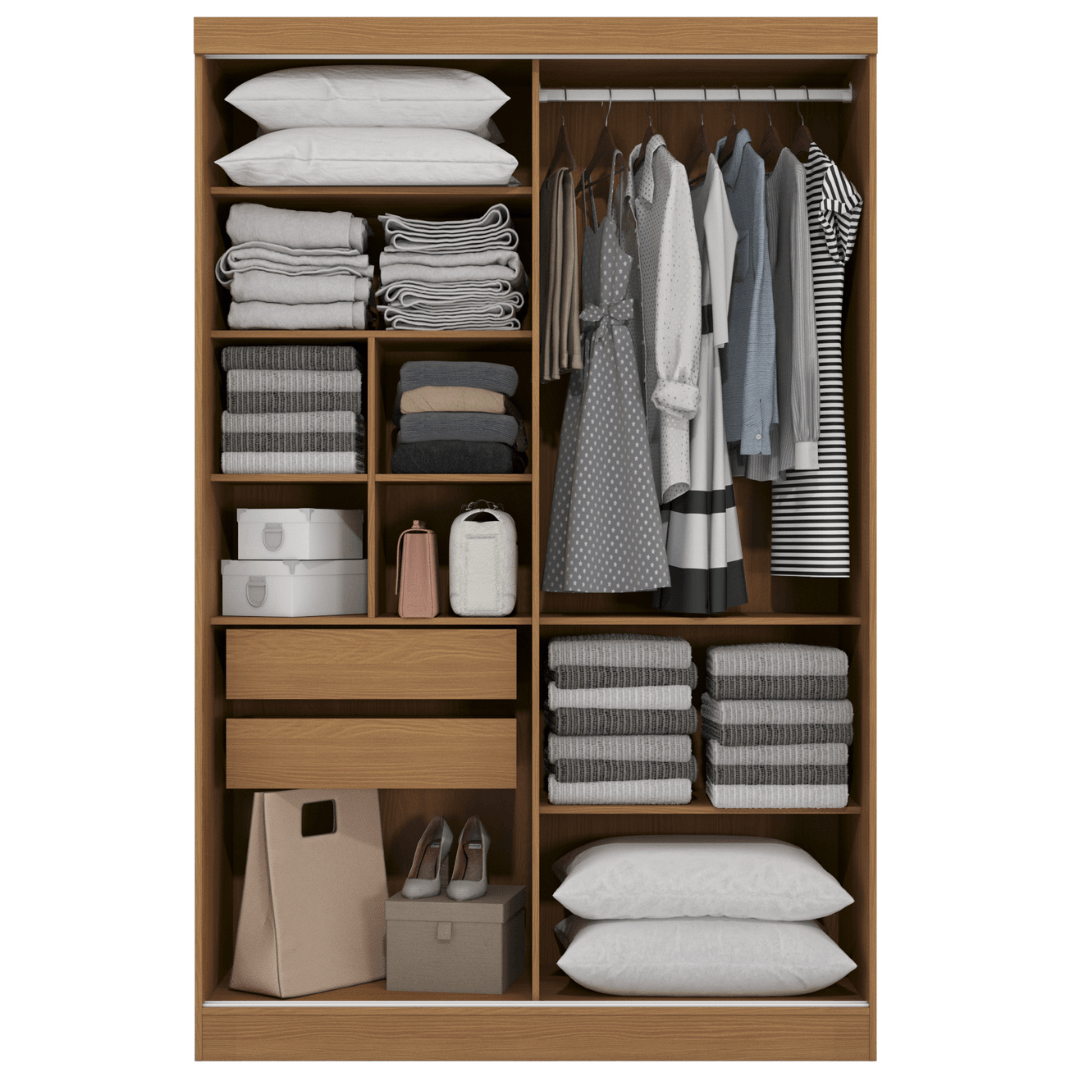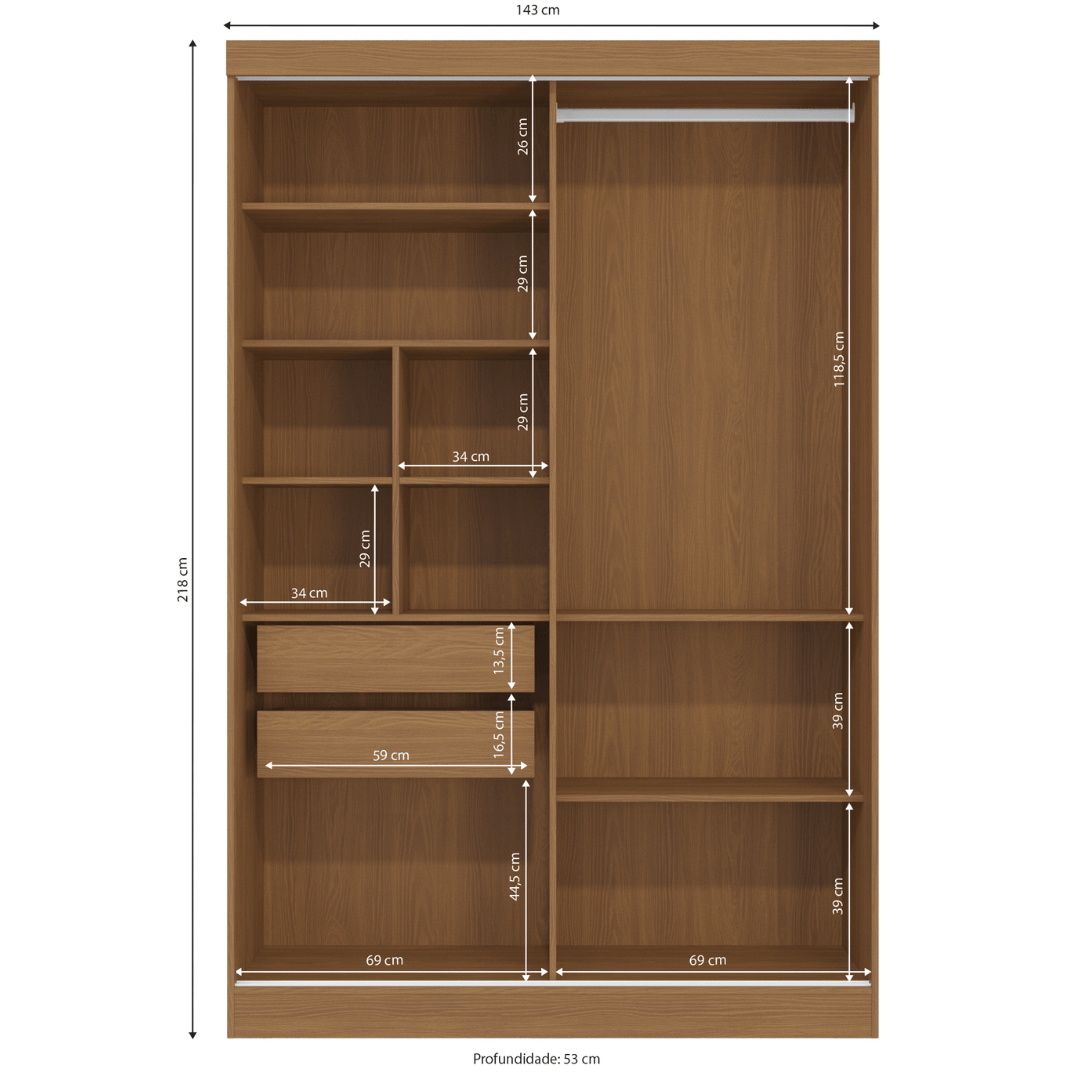 As portas de correr facilitam o acesso ao interior do guarda-roupa sem ocupar espaço adicional, tornando-o ideal para quartos compactos. As duas gavetas extras proporcionam um espaço adicional para organizar roupas e acessórios. No interior, o guarda-roupa também possui prateleiras e cabideiros para uma organização mais eficiente.