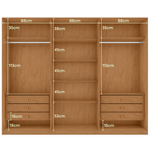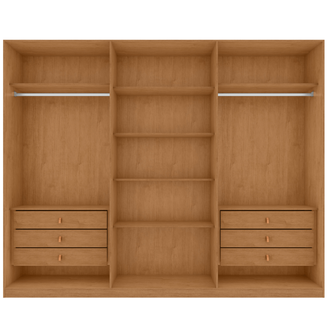 No interior, o roupeiro é completo: conta com 6 prateleiras espaçosas, 6 gavetas internas com corrediças telescópicas metálicas e 2 cabideiros, garantindo organização inteligente para roupas, calçados, acessórios e muito mais.