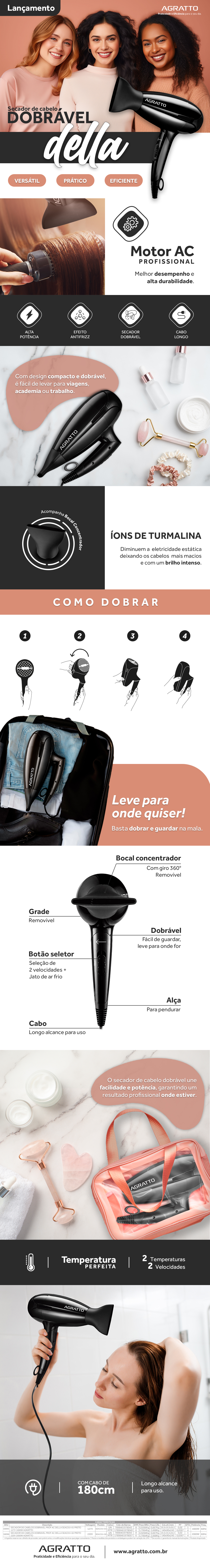 Seja para uso diário ou para levar em viagens, o Secador de Cabelo Dobrável Agratto Della 2000W 220V é a escolha perfeita para quem busca praticidade, alta performance e efeito de salão dentro de casa. Com design moderno e compacto, ele alia potência, tecnologia e facilidade no manuseio, proporcionando fios mais macios, brilhosos e com acabamento profissional.