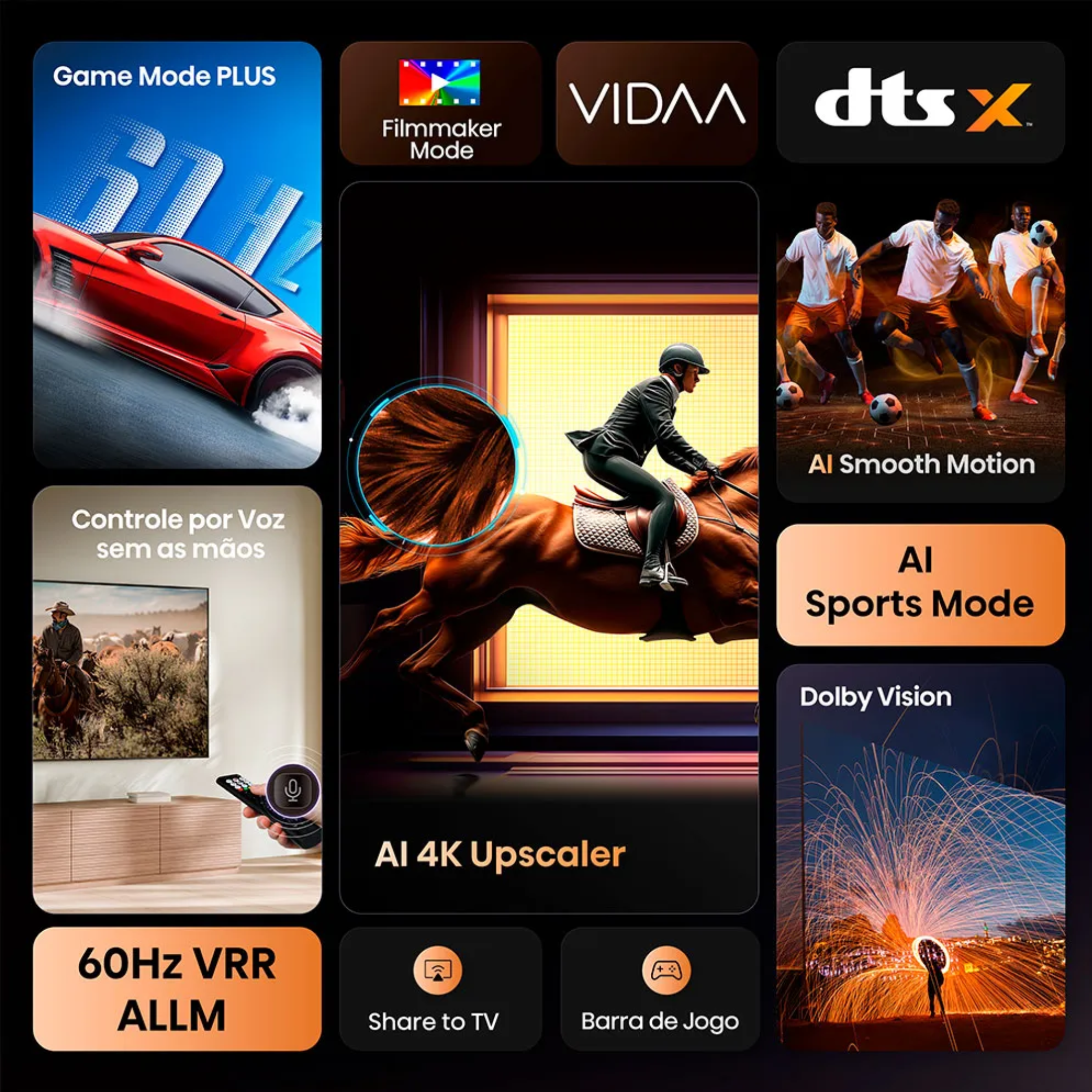 - Recursos gamer: VRR (Variable Refresh Rate) + ALLM (Auto Low Latency Mode) garantem respostas rápidas e fluidez nos jogos.