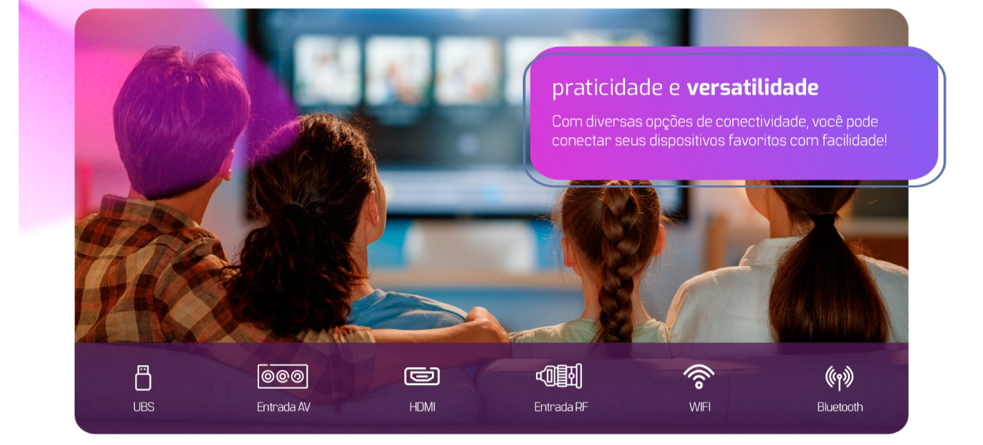 Mesmo em um design slim, a Smart TV HQ 43” oferece diversas conexões: