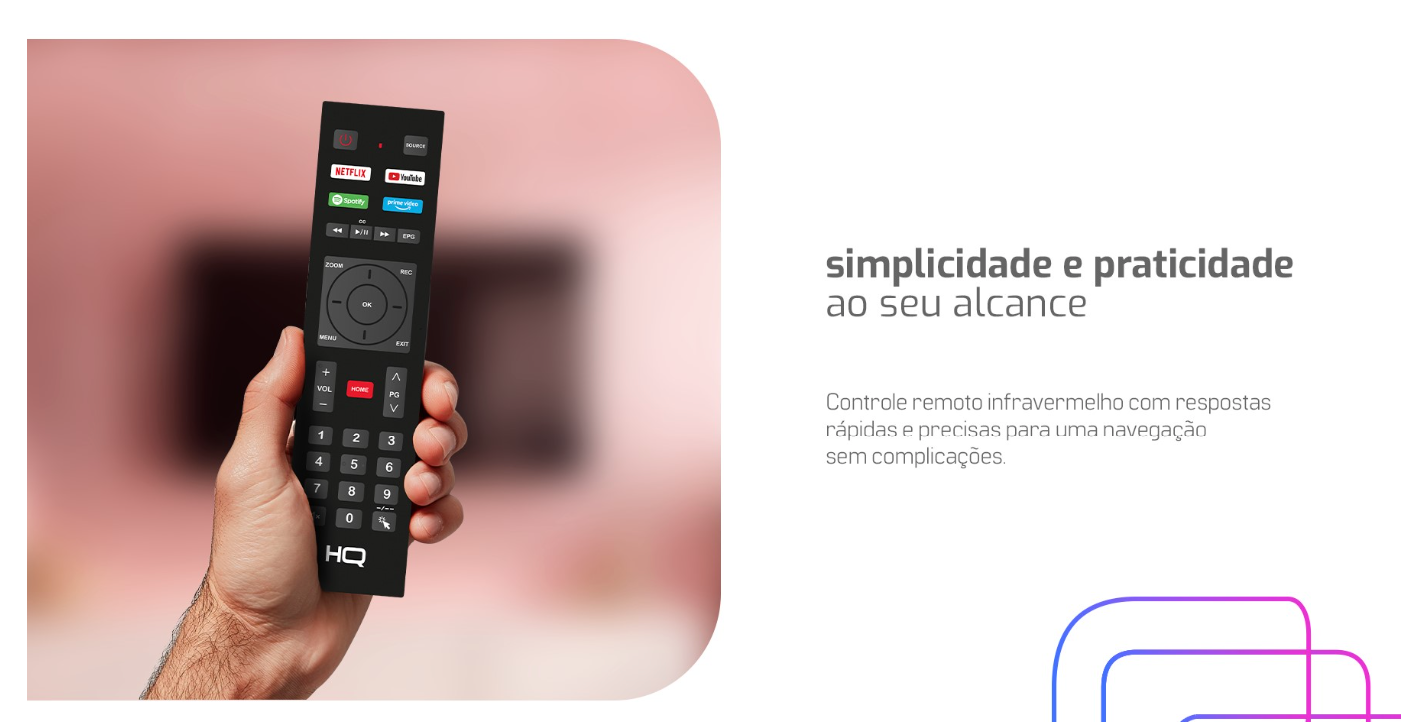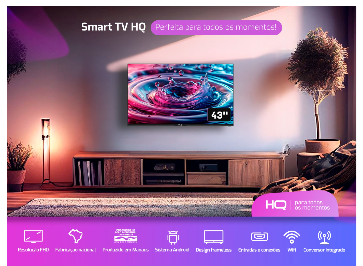 A Smart TV HQ 43” Full HD Frameless é a escolha ideal para quem busca qualidade de imagem, sistema moderno e design elegante. Com bordas ultrafinas e acabamento slim, ela transforma sua sala, quarto ou escritório em um verdadeiro espaço de entretenimento.