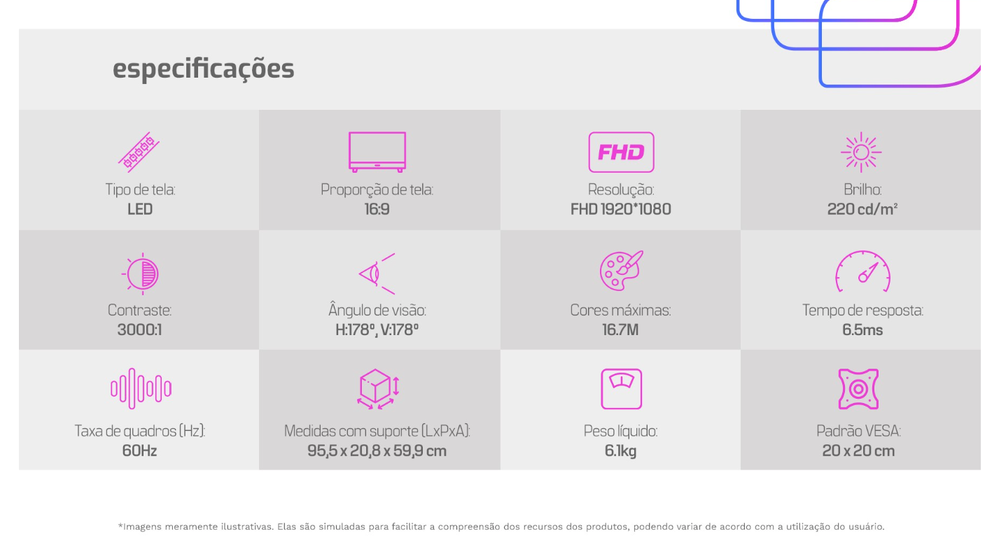 - Design Frameless Slim: bordas ultrafinas que valorizam o ambiente
