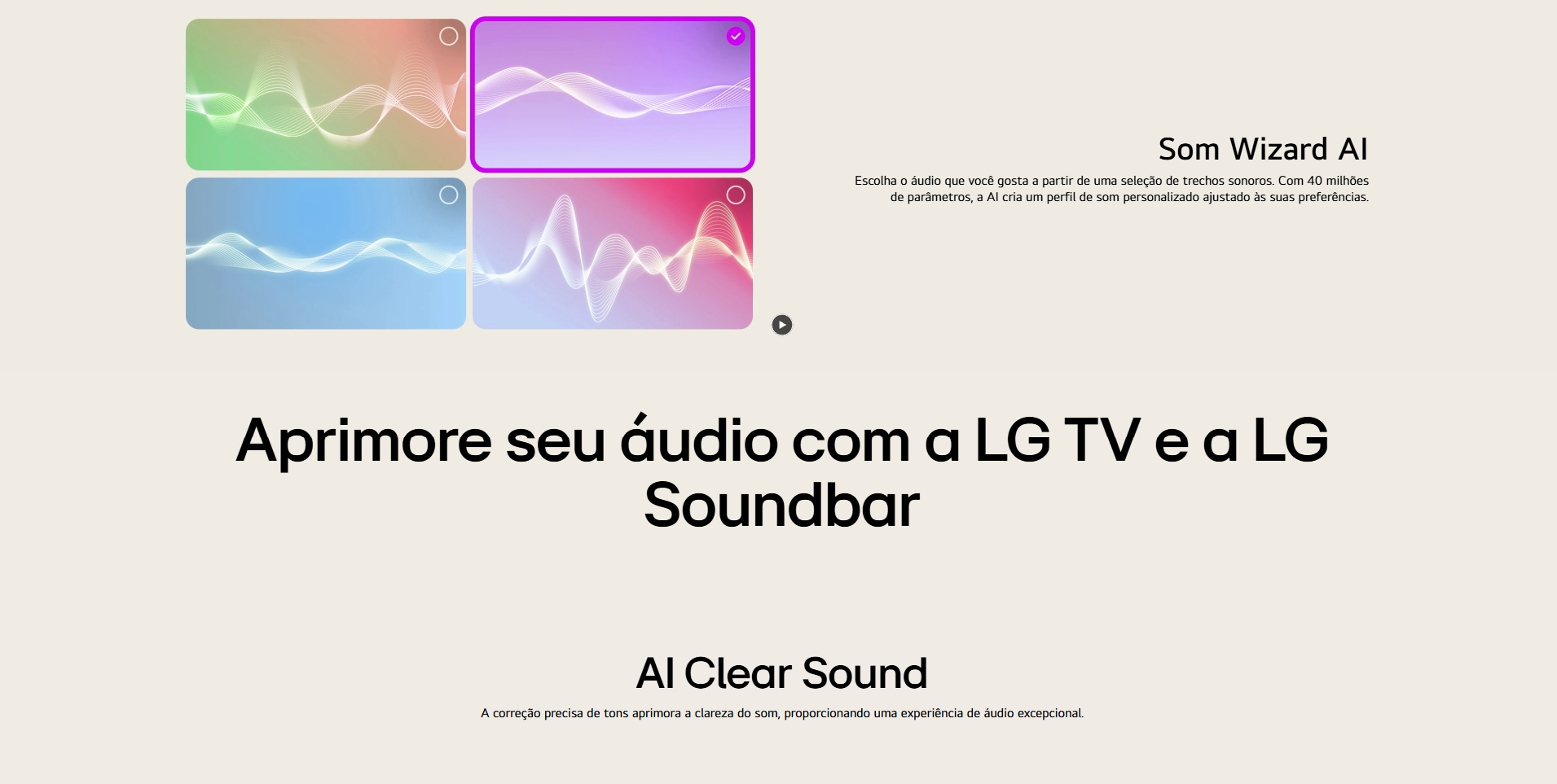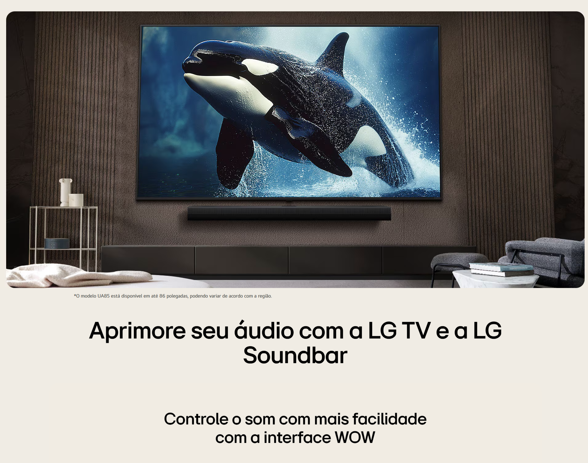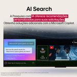 A navegação torna-se prática e intuitiva com o sistema webOS 25, que oferece acesso facilitado aos principais aplicativos e conteúdos. O AI Magic Remote complementa essa experiência com comandos de voz, rolagem precisa e interação inteligente com assistentes virtuais como Alexa e Google Assistente.