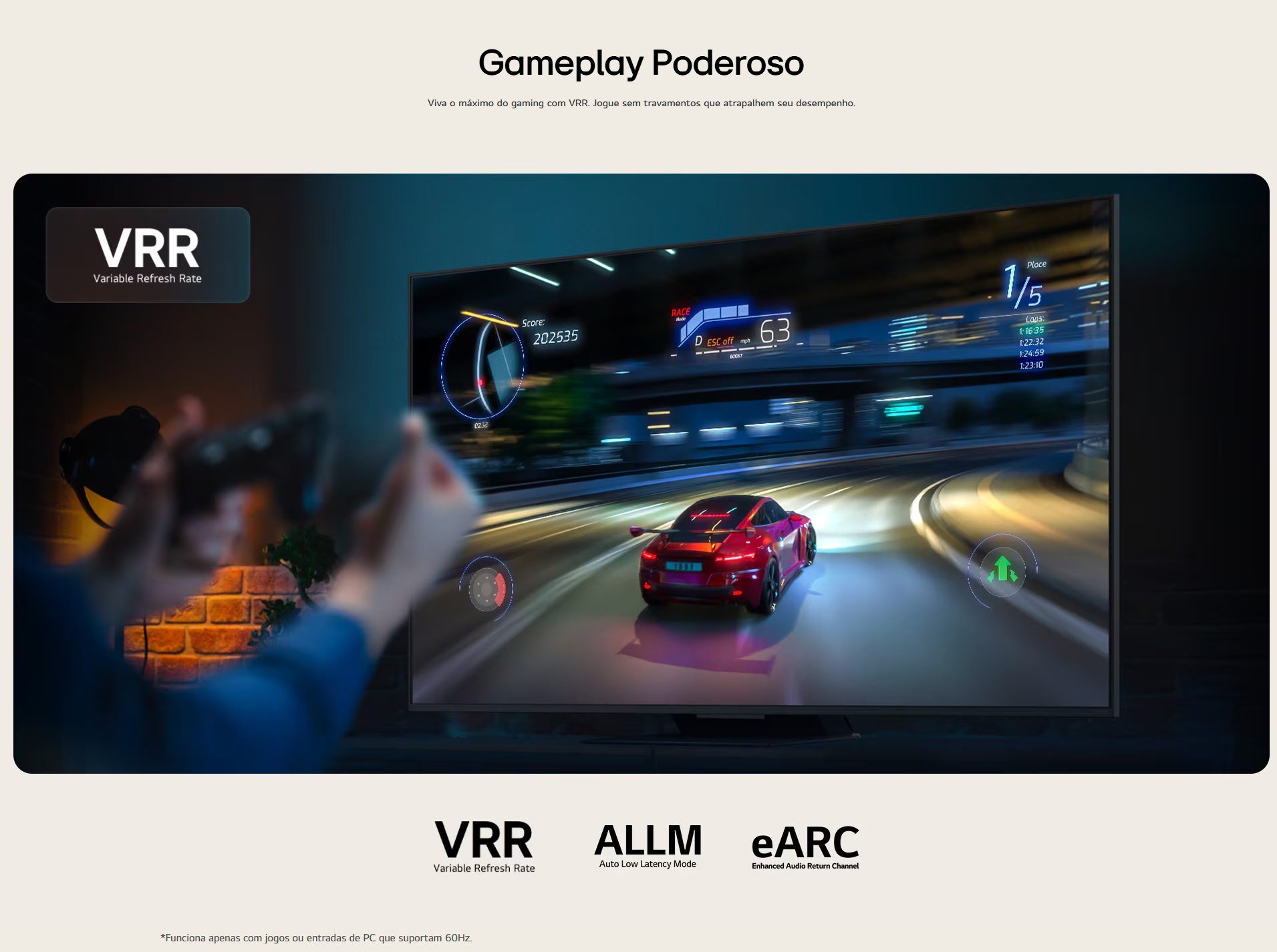 - Conexões amplas: Wi-Fi, Bluetooth, 3 HDMI e 1 USB para alta compatibilidade