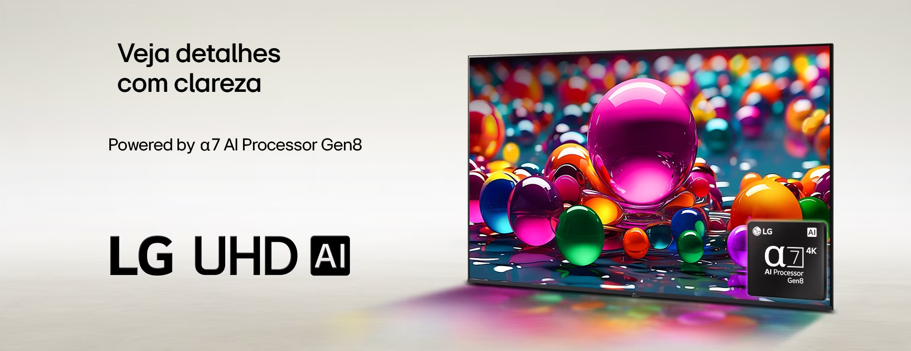 Uma experiência visual que vai além do comum. A Smart TV LG UA8550 oferece imagem de altíssima qualidade com tecnologia 4K HDR10 Pro, que proporciona cores vibrantes, brilho intenso e detalhes impressionantes em qualquer conteúdo. Mesmo vídeos com menor resolução ganham nitidez e profundidade por meio do recurso 4K Super Upscaling.