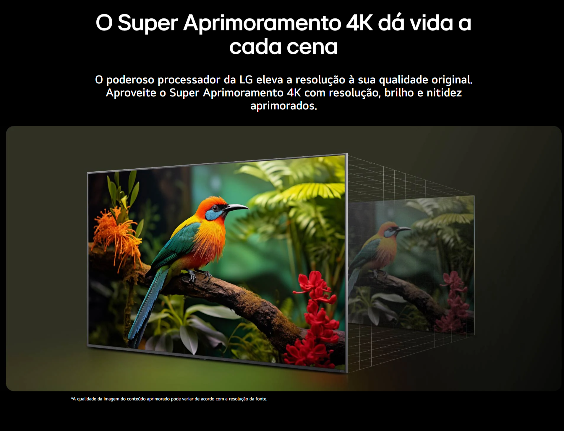 - Imagem 4K HDR10 Pro + Super Upscaling: qualidade superior mesmo em conteúdos de menor resolução